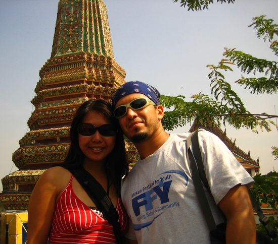 Today, we headed out to Wat Po (meaning: 'to have a secure and peaceful life') to see the famous housed 'Reclining Buddha'. We took a taxi from Nan's to the boat docks, and the taxi driver pulls over onto the side of the freeway pass and tells us that this is our exit! That's a first. Well, he did drop us off right by the stairways to the docks, so we can't complain too much. When we get to the bottom, near the ticket counter, once again, there are two lines: one for the Thais, one for the tourists. Guess which line we stood in?