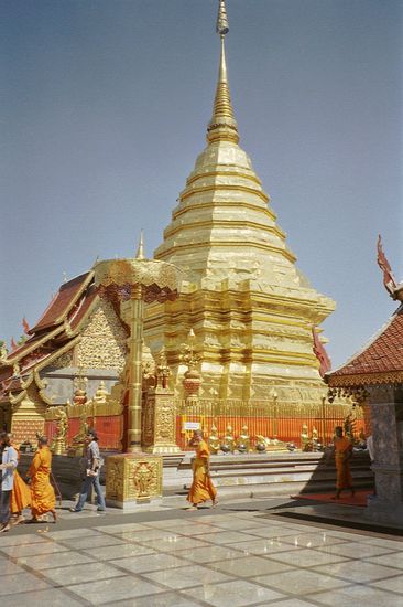 [b][Eddie: ][/b] Despite all, we make it to visit some beautiful temples before we leave, among others the absolute temple-highlight so far, [i]Wat Phra That Doi Suthep[/i], on the top of 300 steps, guarded by two huge stone serpents.