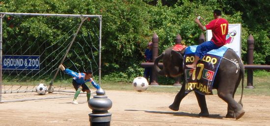 After a quick, cheap lunch, we headed over to the elephant show early to get good seats. First there was a magic show on a small portable stage, but the tricks were pretty bad - only children would be impressed. The elephant show was really good though, and included demonstrations of how they were used for logging, and how they hunted and captured an elephant from the back of another one. They performed a battle simulating how the ancient kings used to participate in combat from elephant-back, with authentic costumes for the riders and the elephants! There were even some pyrotechnics to simulate a cannon assault on a castle wall. Finally, there was the fun part of the show, where a team of elephants wearing the colors of various countries came out onto the field, and did tricks like dancing, picking up objects, and racing through a obstacle course. The best part was a soccer shootout: with a human goalie, the elephants line up and kick giant soccer balls at the net one at a time. Whenever an elephant scored, it would do a little victory dance!