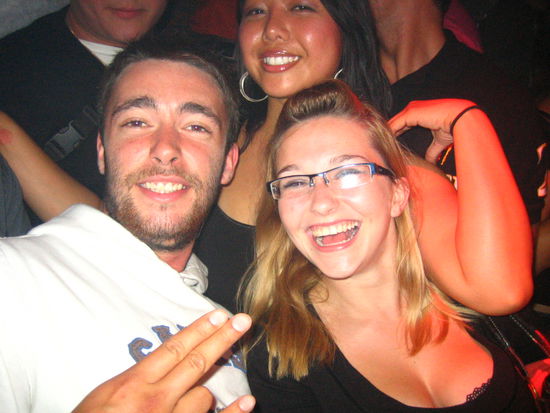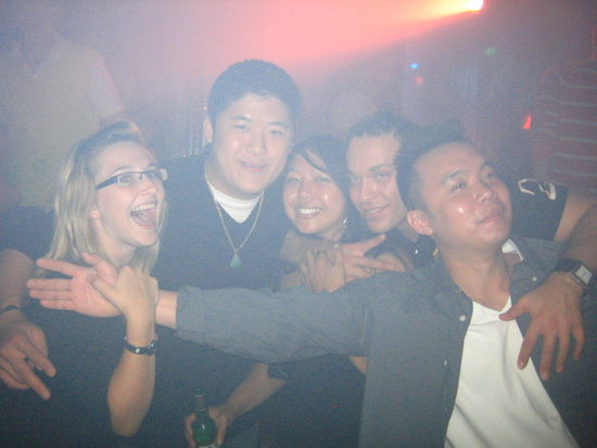 So as I was heading out the door, this guy (bald guy below) calls me over to the table with his friends. Anyways, he starts telling me how pretty I am, etc, etc and I'm laughing and joking around with him, and then I whisper to him, "Hey, you know who I have a crush on?"