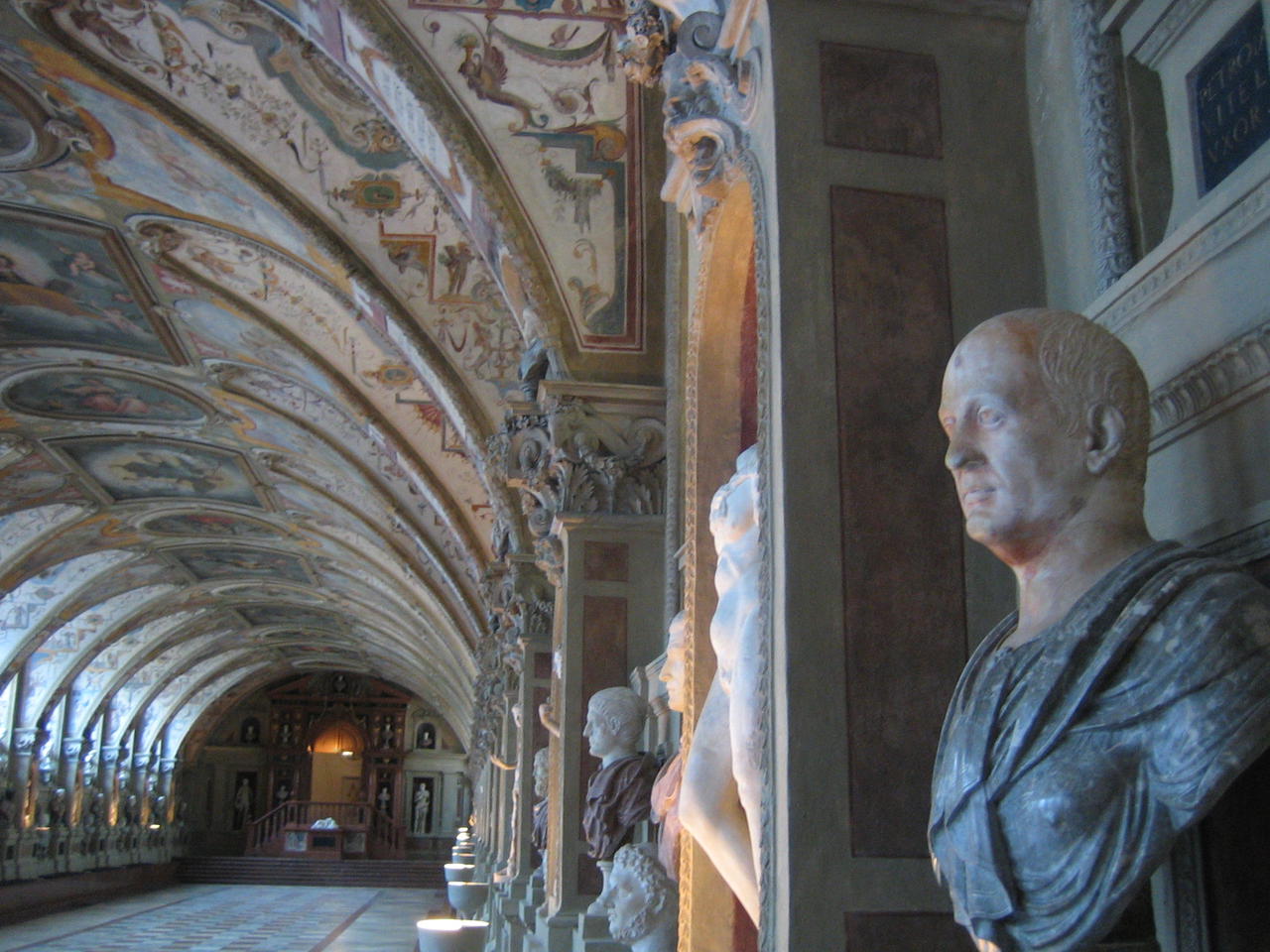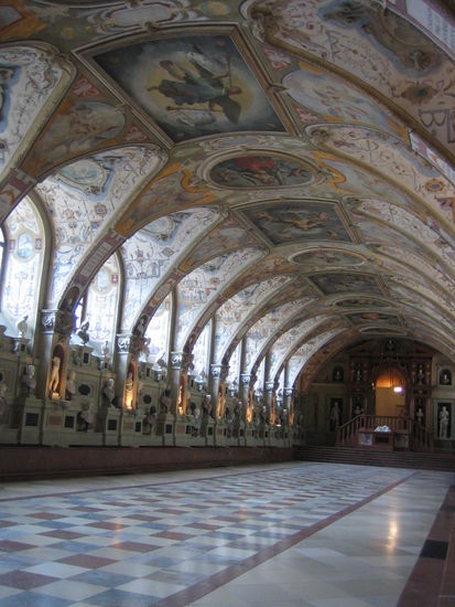 "This hall is the oldest room of the Residenz München. 66 metres long, it is the largest and most lavish Renaissance interior north of the Alps. Duke Albrecht V had it built from 1568 to 1571 for his collection of antique sculptures. These antiquities gave the room its name "Antiquarium".