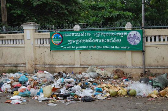 Phnom Penh, Cambodia's capital of 1,5 million people, is a city of contrasts. Its outskirts stretch into some vast green rice fields, followed by some barren, desert-like grounds before the city itself begins. There is huge traffic here, much more than I would expect for a city of that size, with no rules applying at all with the exception that softer or weaker targets make way to the bigger ones. That means trucks and buses intimidate everyone and everything, motorcycles just bother pedestrians, and if you walk, you better have good reflexes, health and life insurance in your pocket, and the first-aid kit nearby, as you will be ignored as a traffic participant. As foreigners involved into accidents are always found to be the guilty and therefore paying party, local recommendation is to leave the place of an accident as quick as possible.