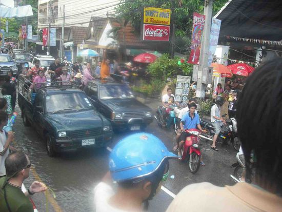 On the way back, we got into the Songkran festival, which is a four-day-celebration of New Year and involves A LOT of water. Basically, all the locals line up along the roads with big buckets of water and all kind of pump-guns, super soaker and other water-spreading equipment, and spread it on everyone passing by. An open truck full of foreigners of cause was a temptation no one could resist, so our misery of being wet spread over twelve hours. Unfortunately, due to the water involved there are only a few pictures of those daring to risk their equipment.