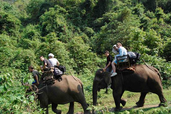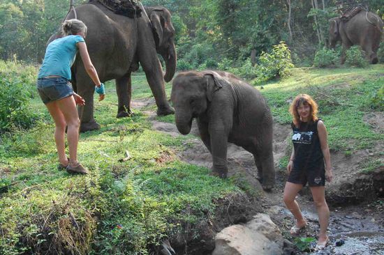 Later on, we jumped on elephants in teams of four and took a one-hour ride. Sitting on their head behind their ears in contact with their skin is like treating your legs with sand paper for some time and leaves quite some marks, if not an ugly rash that heals badly, not talking about convenience. But it is worth the experience, and the elephant baby accompanying us was really cute.